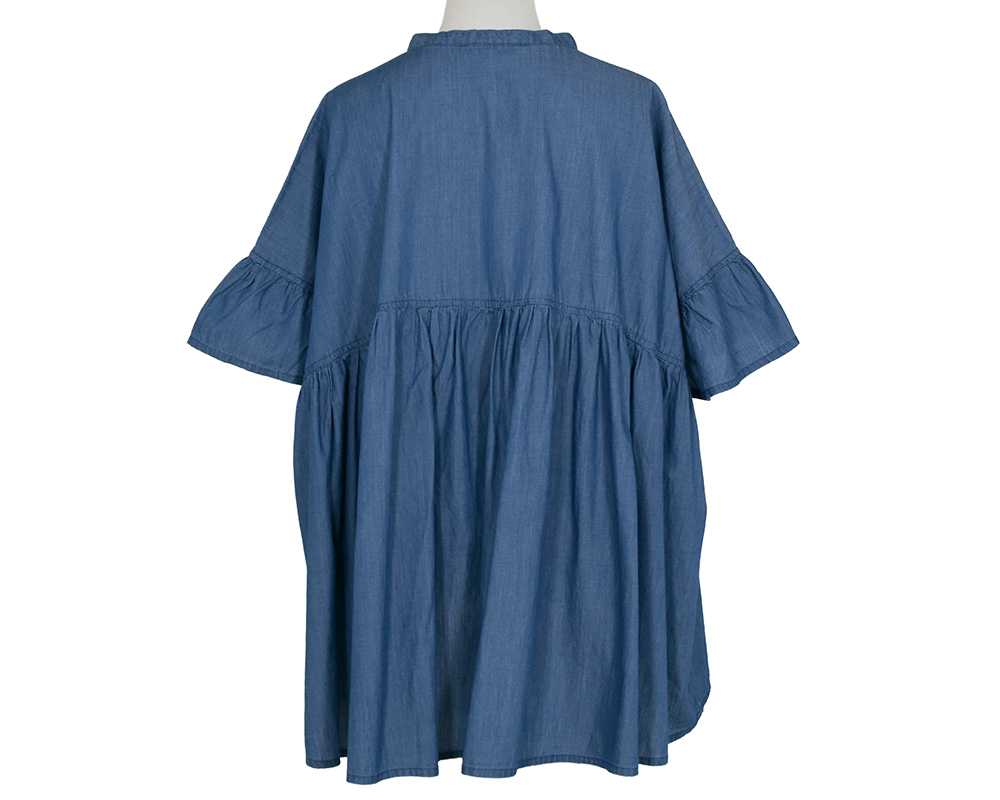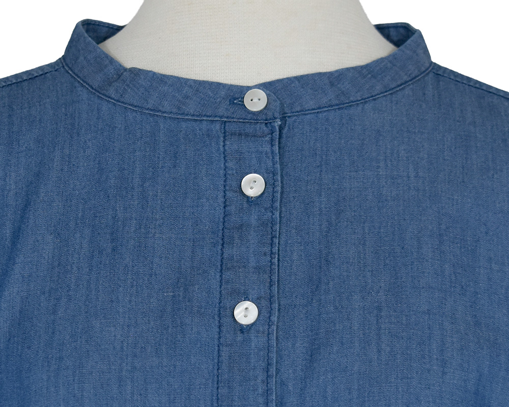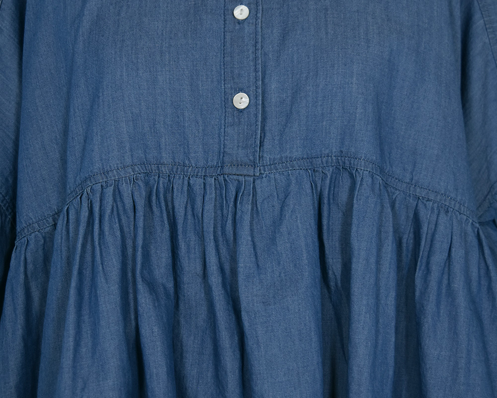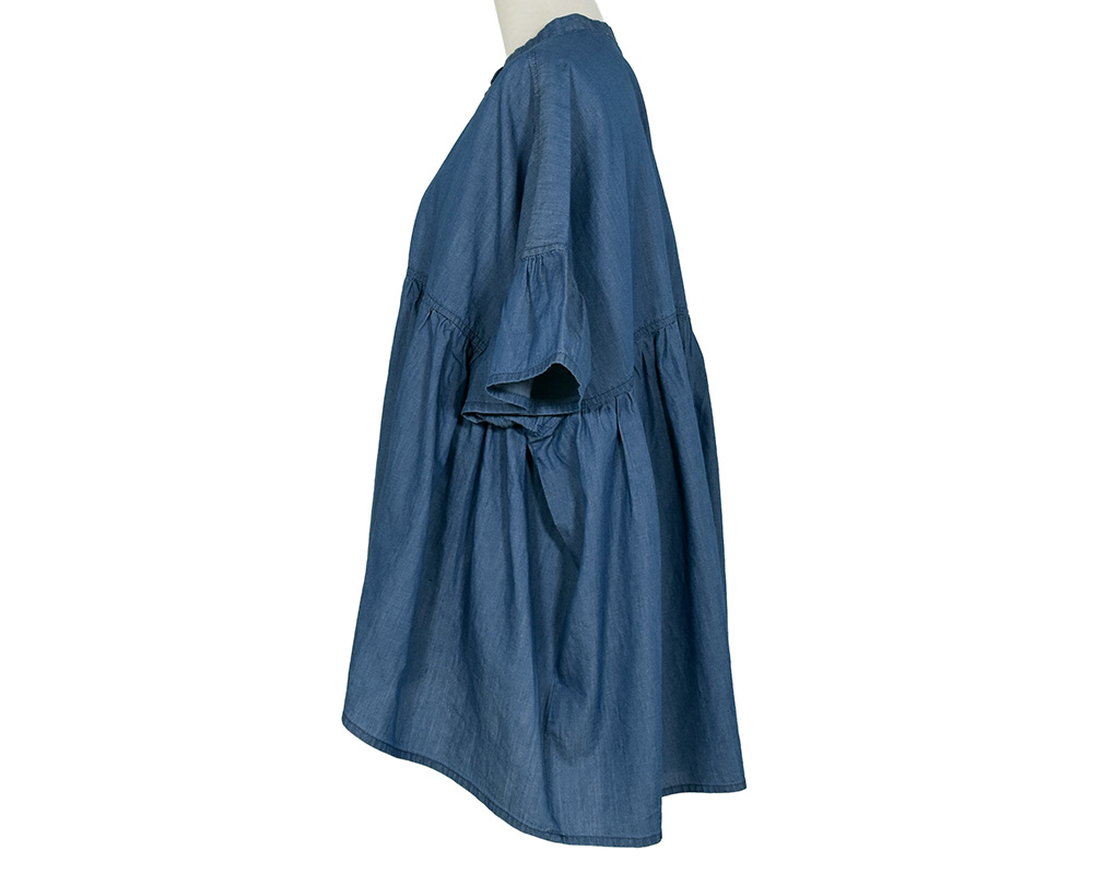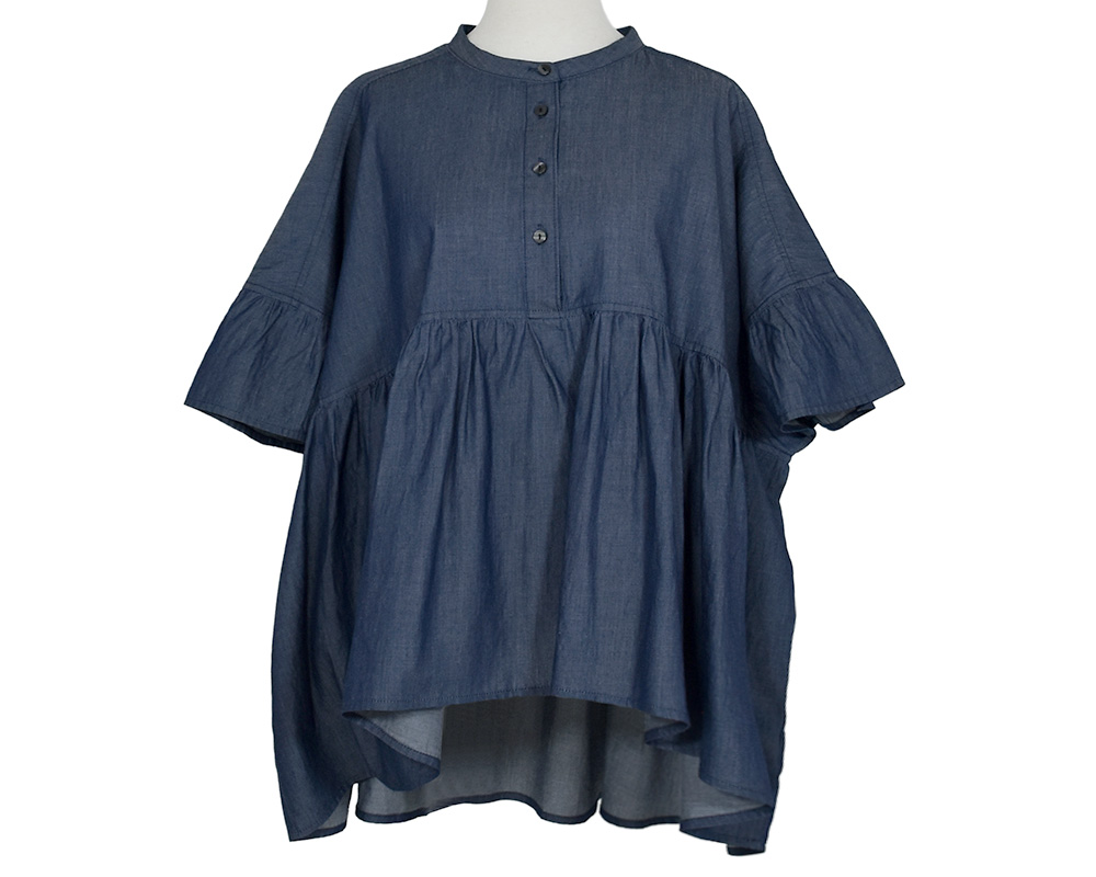 切り替え下にギャザーをたっぷり寄せた、軽やかな印象のスタンドカラーブラウスです。袖のフレアがほどよい女性らしさを添え、前後で長さを変えた裾に動きのあるデザインです。前立てのボタンがさりげないポイントになっています。