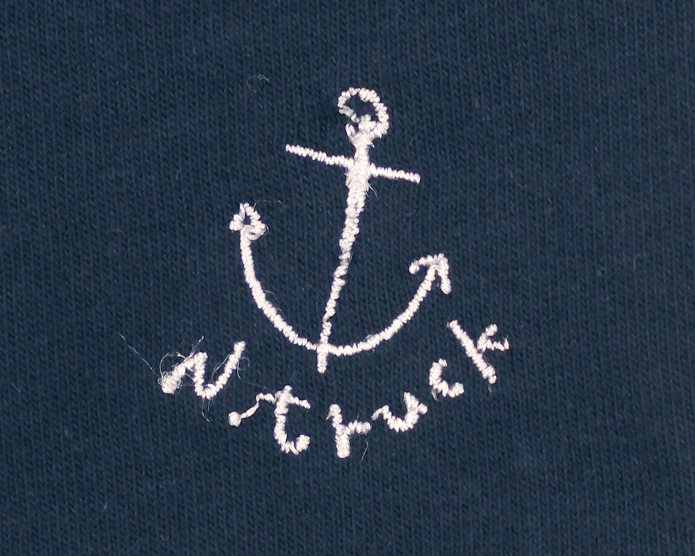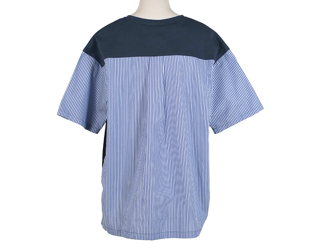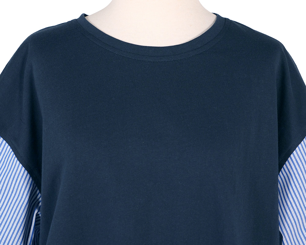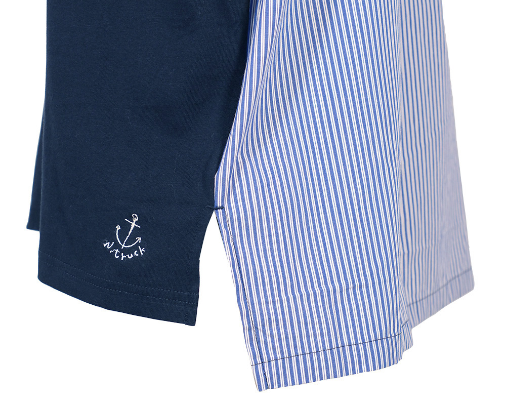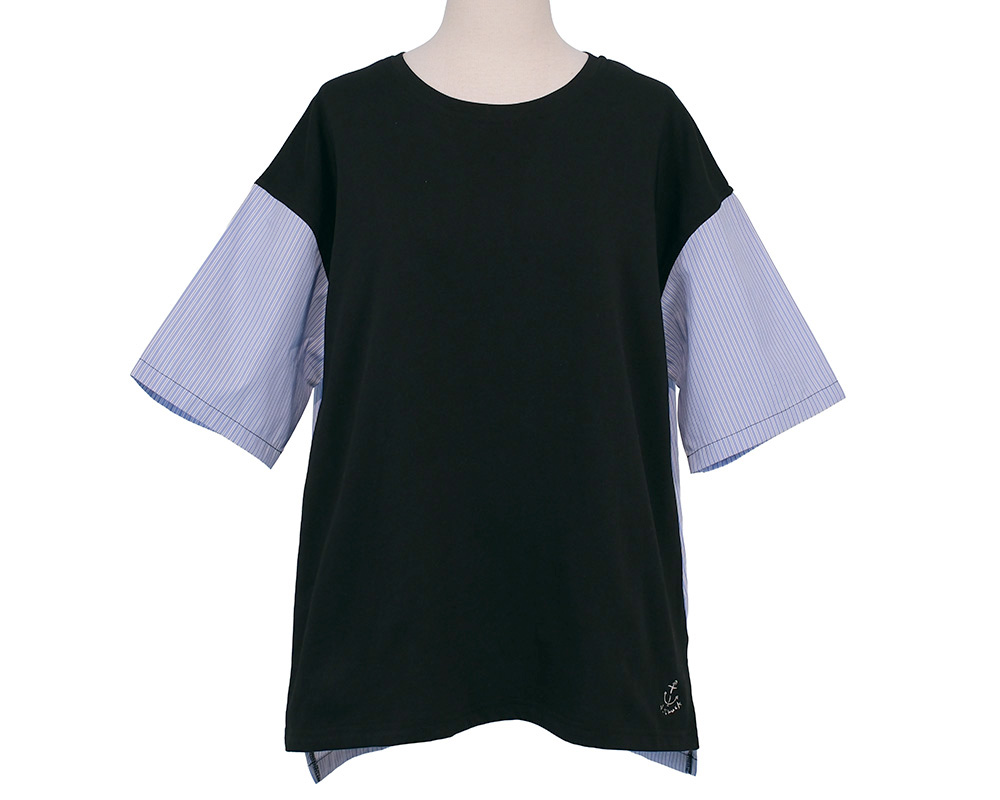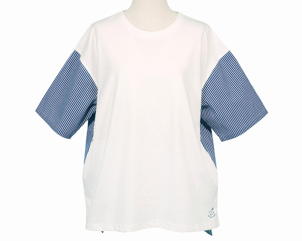 袖と後ろ身頃にストライプ生地を切り替えたデザインのTシャツです。前身頃はシンプルにまとめつつ、動くたびにストライプがほどよい存在感を演出。裾にはイカリマークのワンポイント刺繍をあしらい、マリンテイストをさりげなくプラスしました。カジュアルコーデに季節感と遊び心を添えてくれる一枚です。