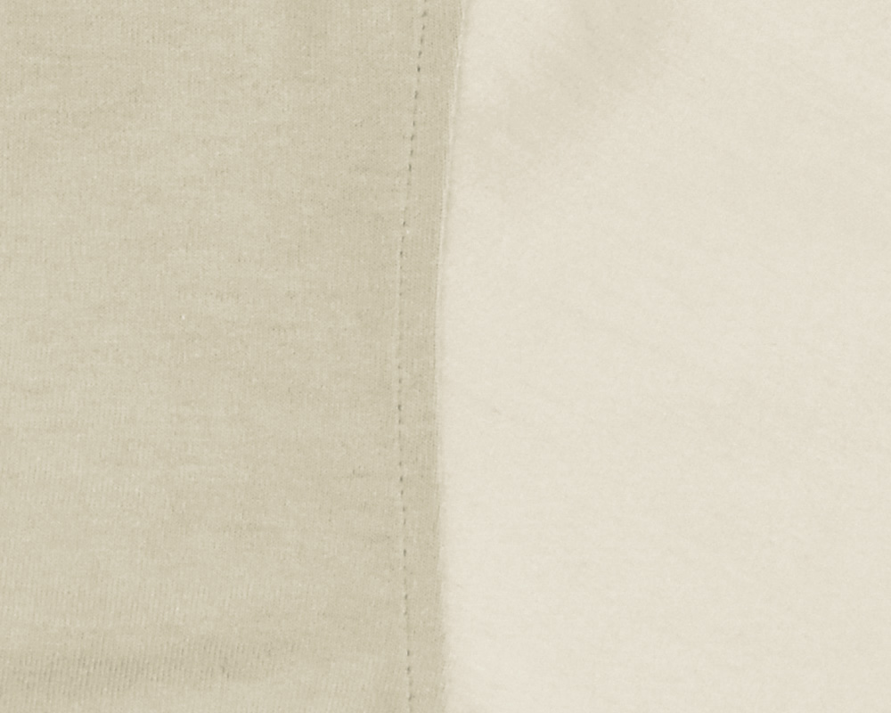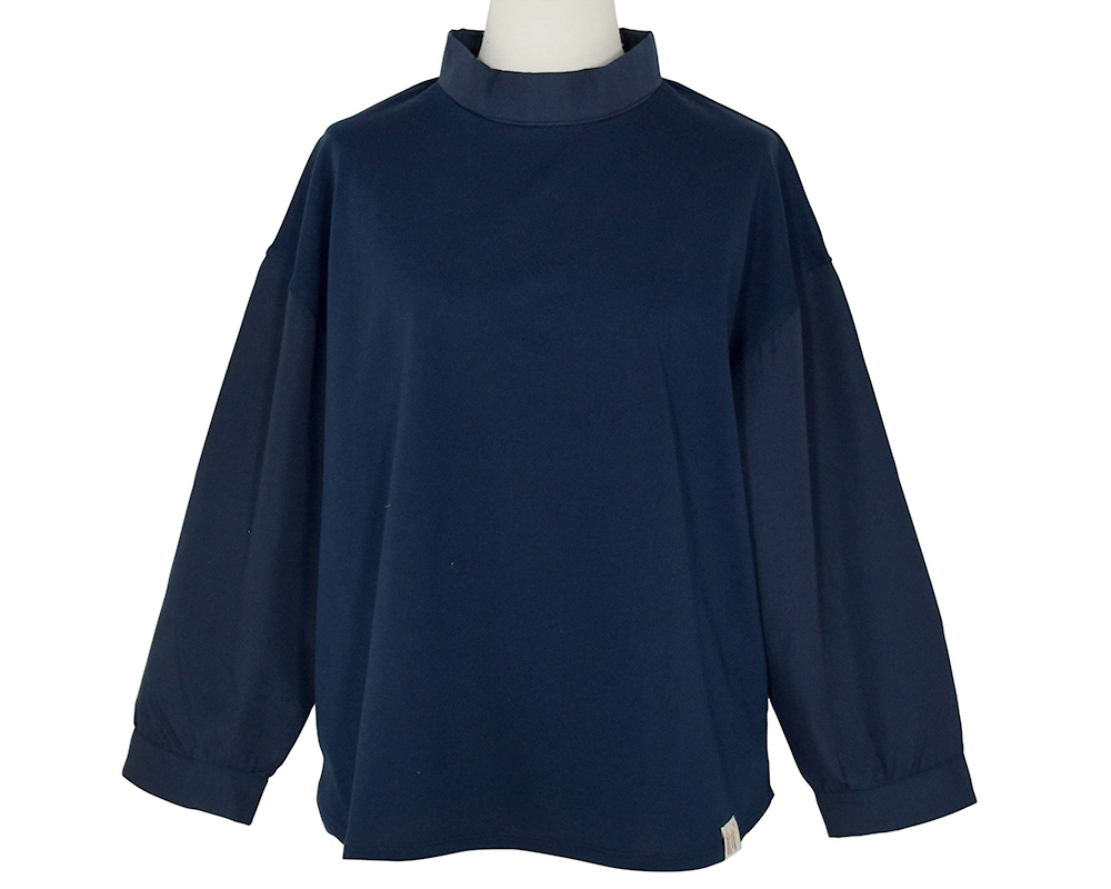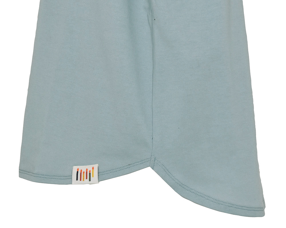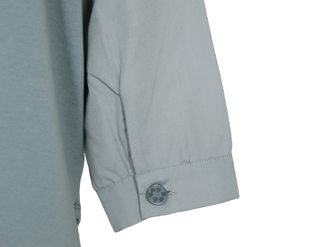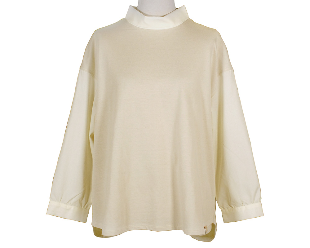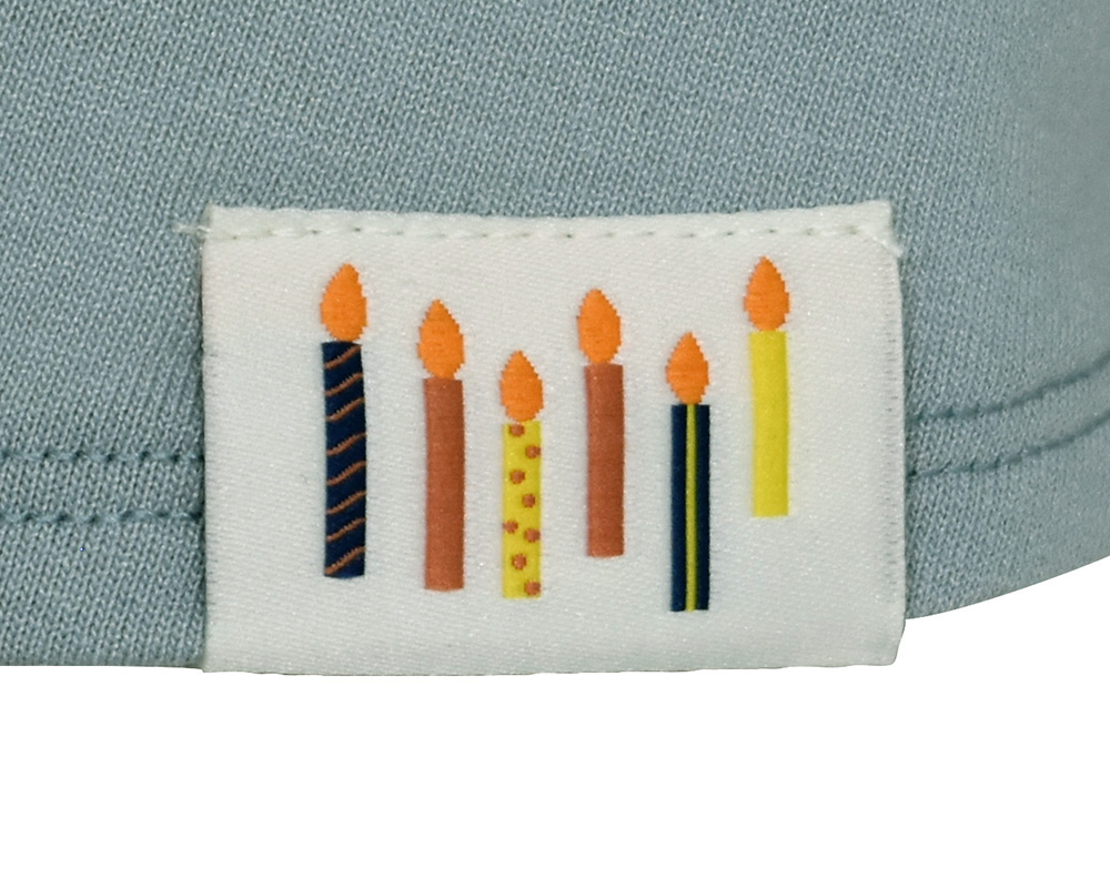 異素材の組み合わせで、1枚でもレイヤード感のあるプルオーバーです。カットソー部分はポリエステル綿のMVS天竺素材です。布帛部分はオフのみ配色ストライプ、その他は本体同色で合わせました。ショートケーキのボタンや6本のろうそくをデザインしたピスネームは、6歳のお祝いをモチーフにした、遊び心のあるディティールです。