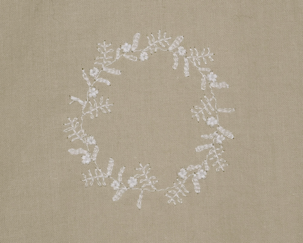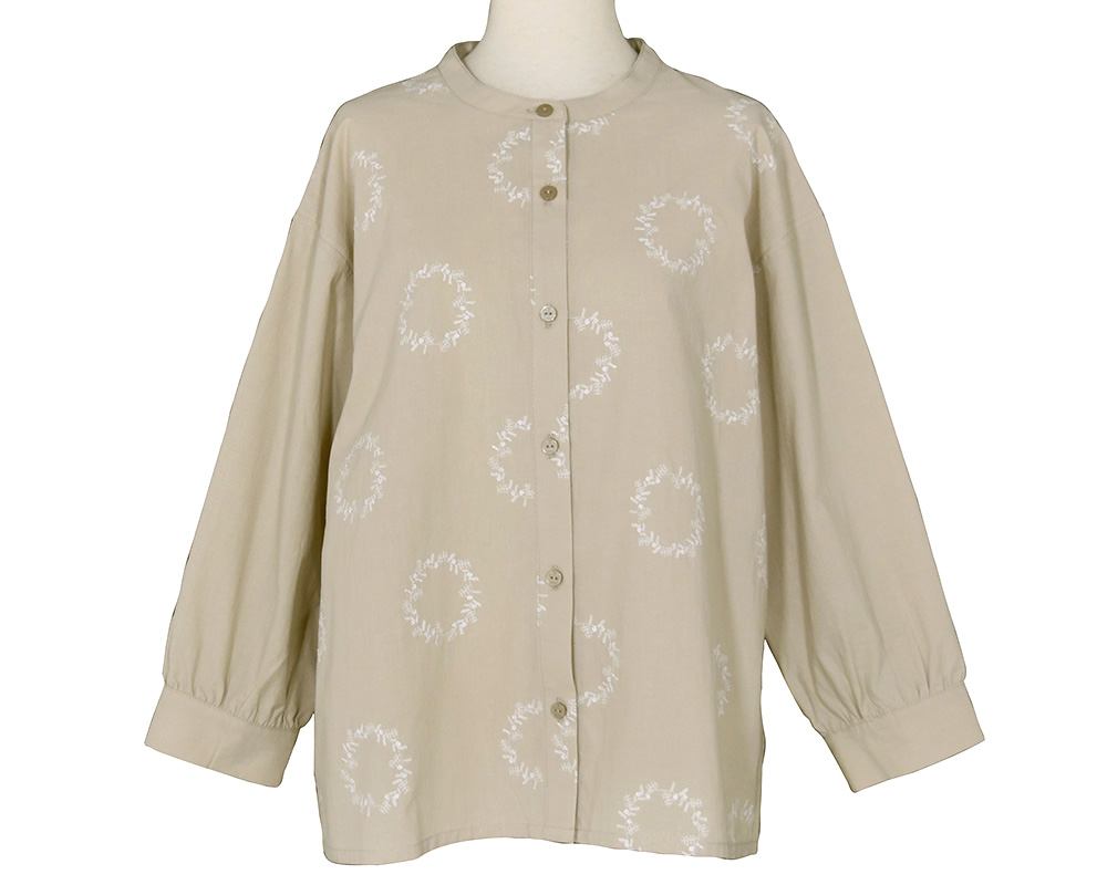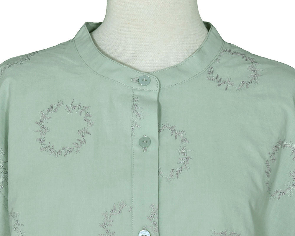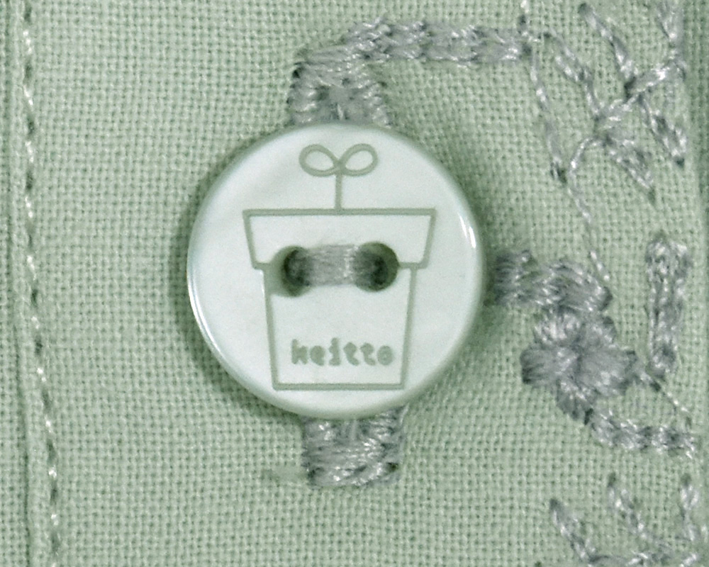 前後身頃に、にわのわ刺繍をあしらったブラウスです。やわらかな綿素材に、庭に植えたローズマリーの刺繍をあしらいました。UVカット機能も備え、春夏の日差しの下でも安心して着られます。植木鉢をモチーフにした彫り柄ボタンを添え、家庭菜園のたのしさを感じられるワンポイントにしました。