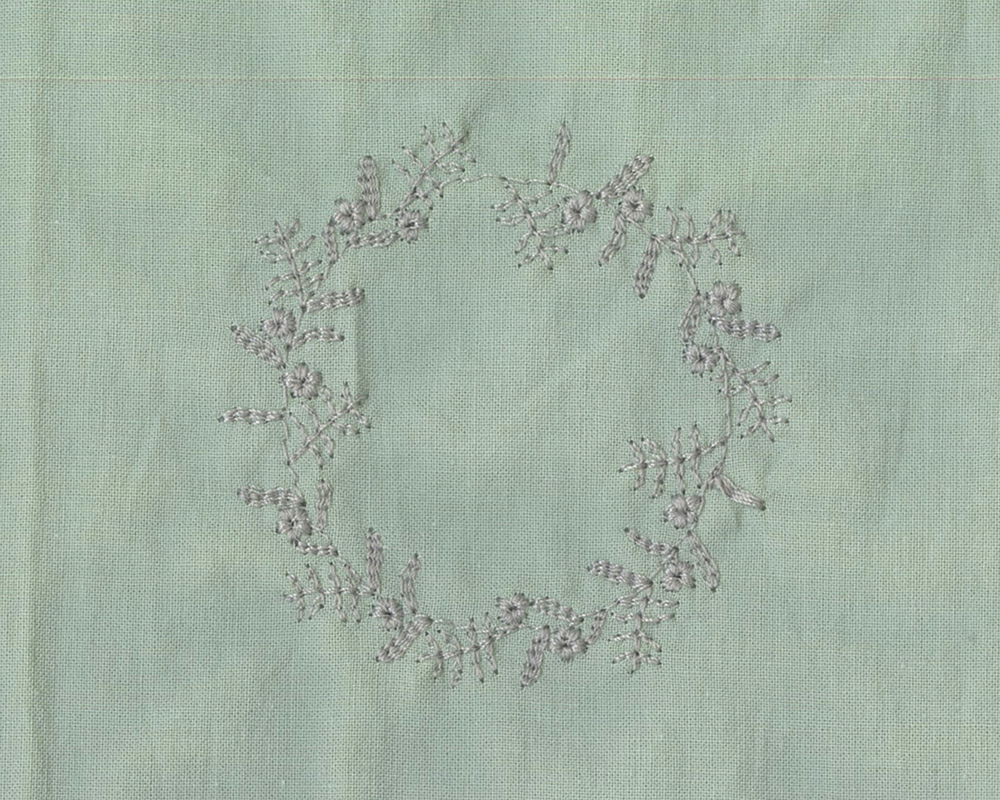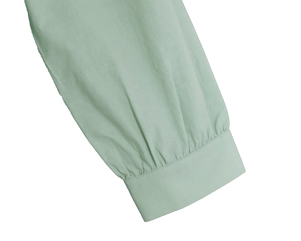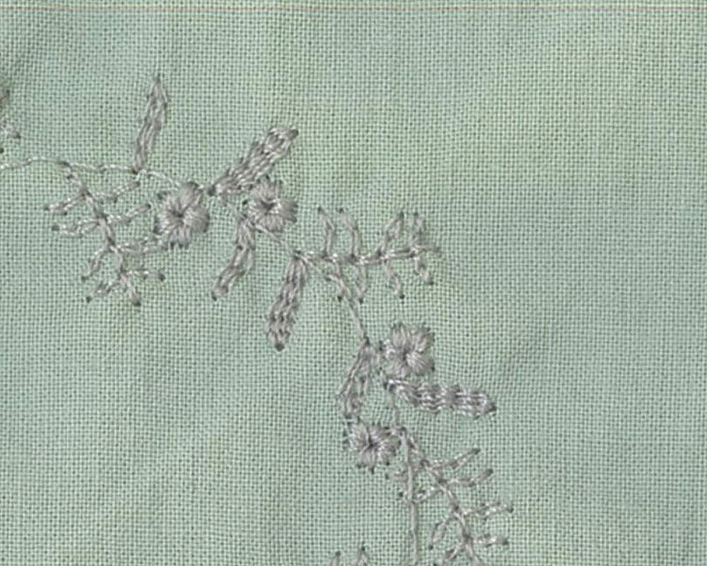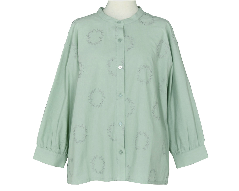 前後身頃に、にわのわ刺繍をあしらったブラウスです。やわらかな綿素材に、庭に植えたローズマリーの刺繍をあしらいました。UVカット機能も備え、春夏の日差しの下でも安心して着られます。植木鉢をモチーフにした彫り柄ボタンを添え、家庭菜園のたのしさを感じられるワンポイントにしました。