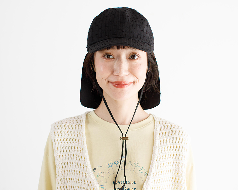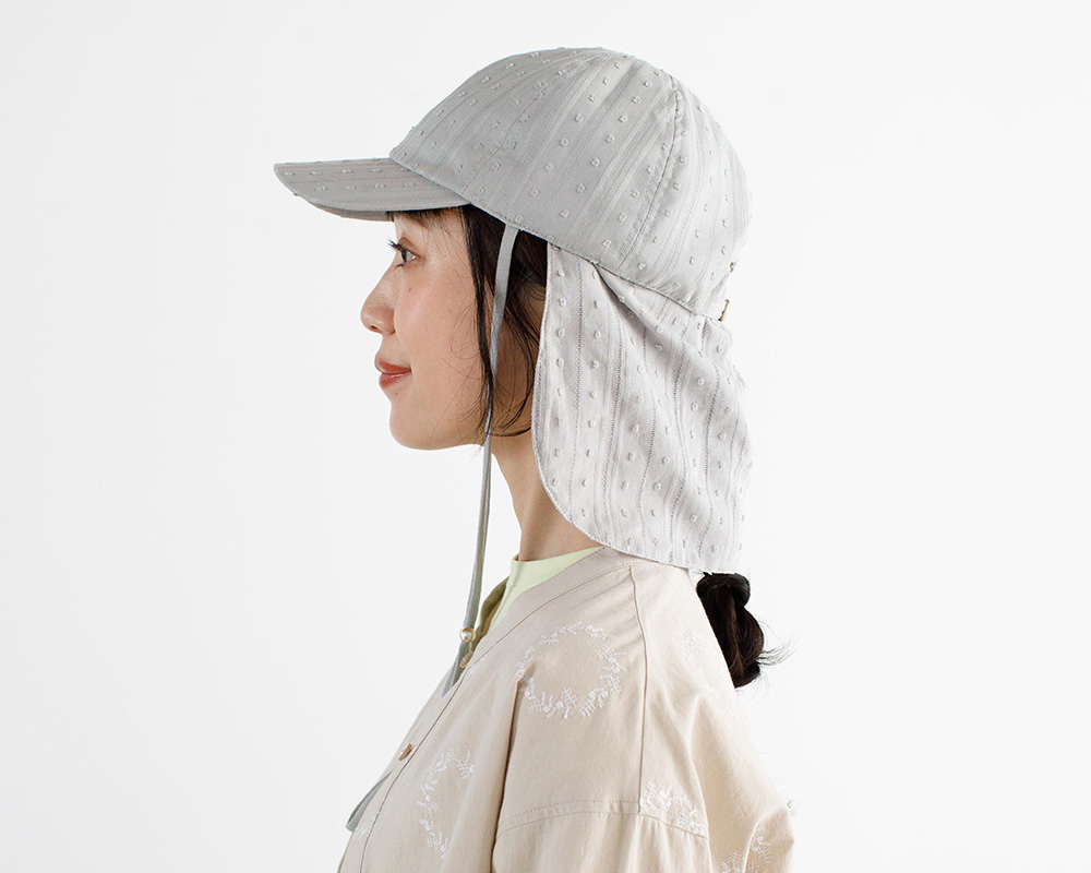 しっかり日差しをカットできるサンシールド付きのキャップです。綿100%のスノーカットドビーストライプの生地を使用。表面感のある素材がデイリーコーデと相性ぴったりです。サンシールドは取り外しても着用いただけるので、様々なシーンでお使いいただけるキャップです。