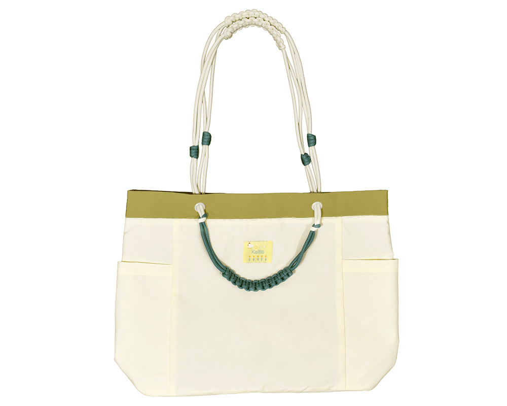 たっぷり入って使いやすい2WAY仕様のナイロントートバッグです。軽くてハリのあるナイロン生地で、雨の日やおでかけにも使いやすい素材感です。にわとりとチューリップをデザインしたピスネームをつけ、遊び心のあるワンポイントにしました。