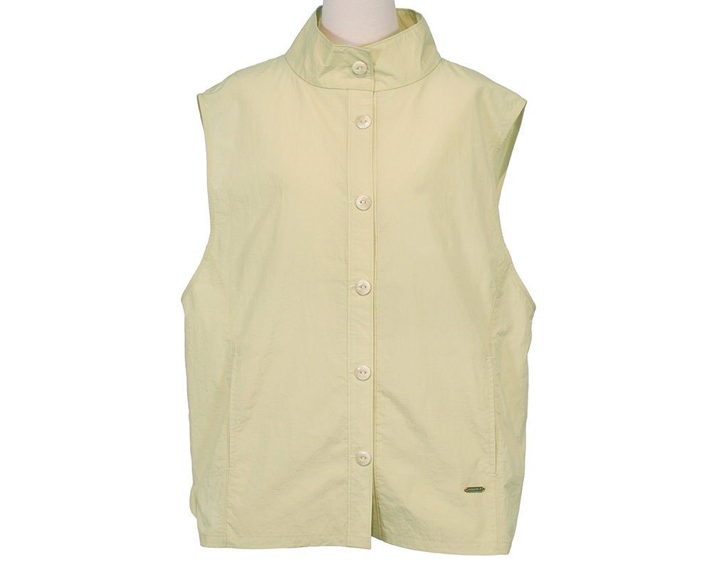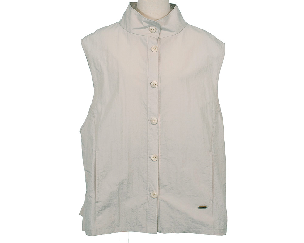 高密度ナイロン生地を使用した、軽やかな着心地のアウターベスト。 季節の変わり目に活躍する薄手仕様で、シャツやカットソー、ニットとのレイヤードにもぴったりです。 後ろ身頃の裾にはバルーンデザインを施し、ふんわりとした立体感と動きをプラス。ポケットは、内ポケットとしても使用できる作りになっており、 2way仕様で便利です。フロントにはヴィンテージライクな金属プレートをあしらい、さりげないアクセントに。 一枚でスタイリングの主役になる、存在感のあるアイテムです。