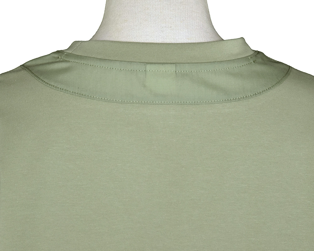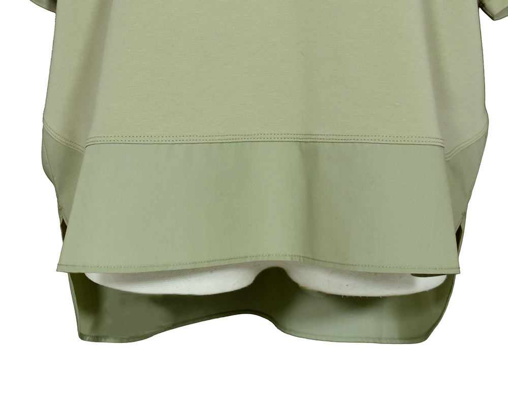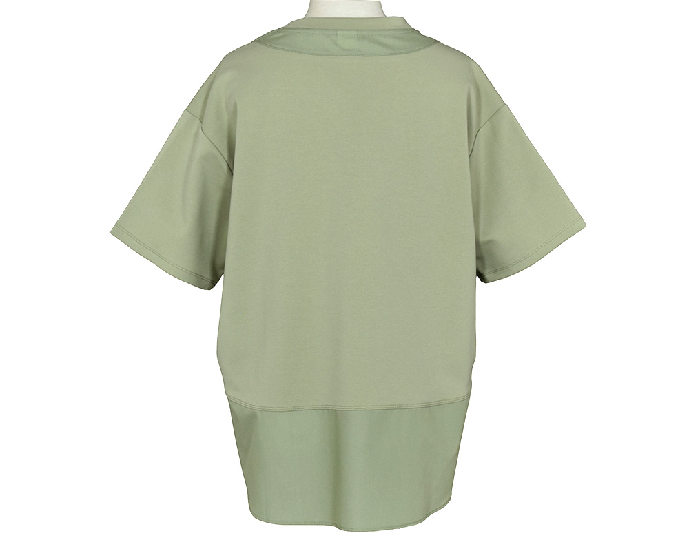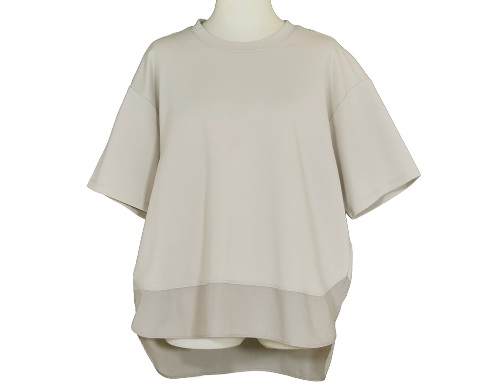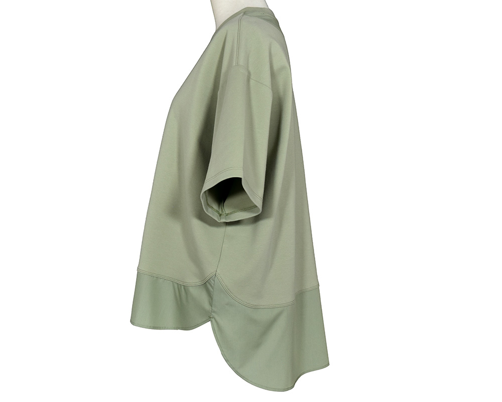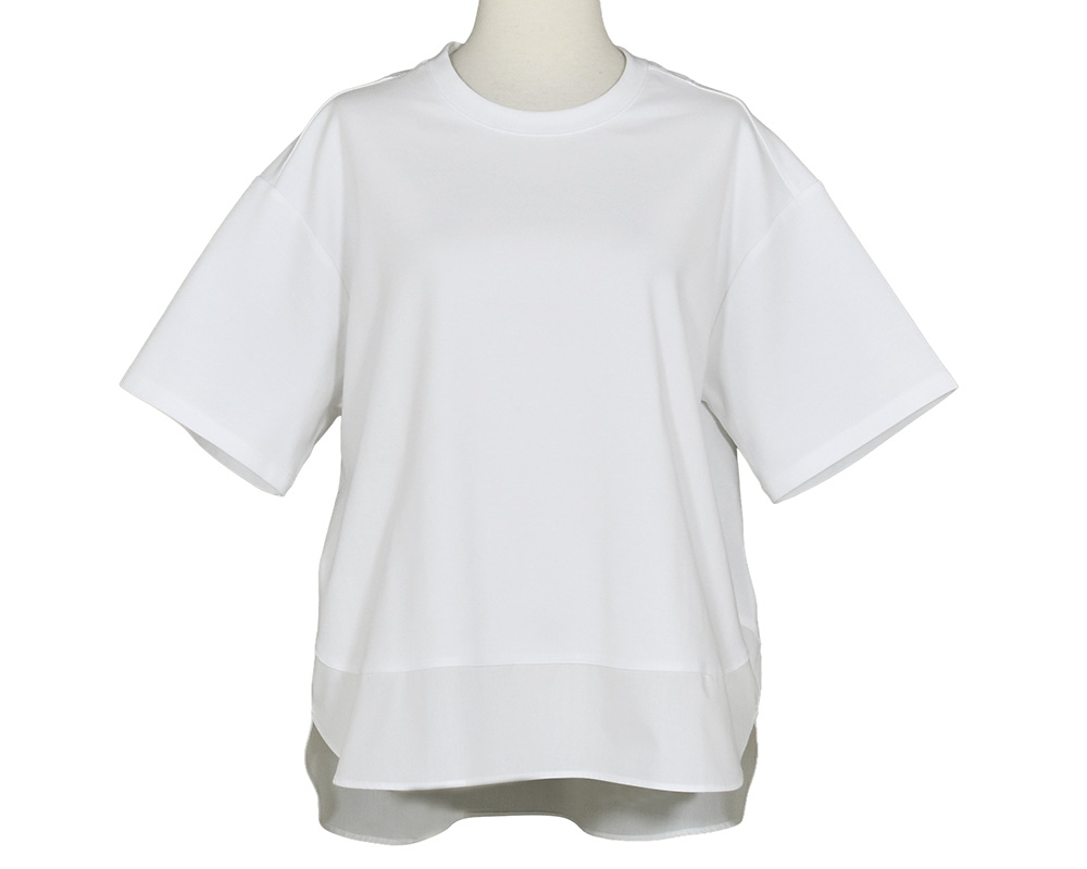 ほどよくゆとりのあるシルエットで仕立てたクルーネックTシャツです。後ネックと裾に布帛を切り替え、シンプルながらさりげないアクセントを添えています。カットソーの心地よさに布帛の軽さが加わった、一枚で様になるデザインです。