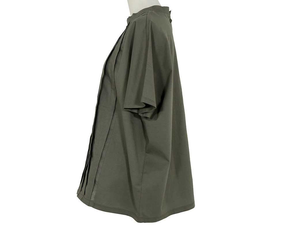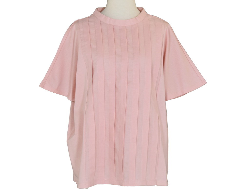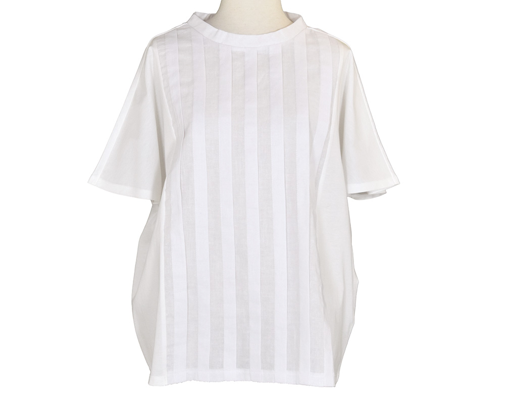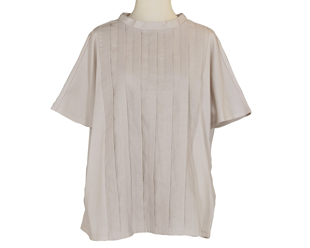 毎年ご好評いただいている布帛タック切り替えのカットソーです。前身頃に布帛を配したことでブラウスのようにきれい見えし、カジュアルすぎない上品な印象に仕上げています。後ろは釦あき仕様で、着脱もしやすいデザインです。