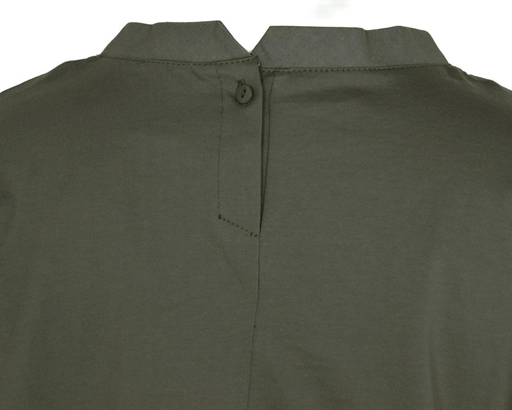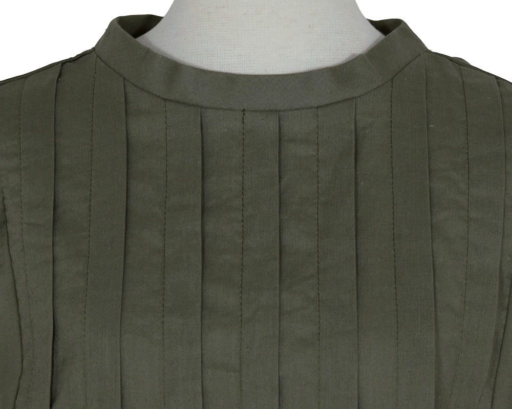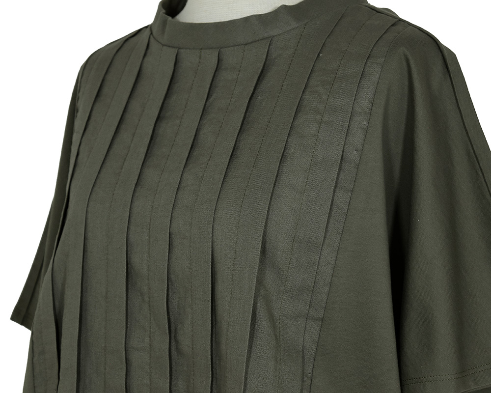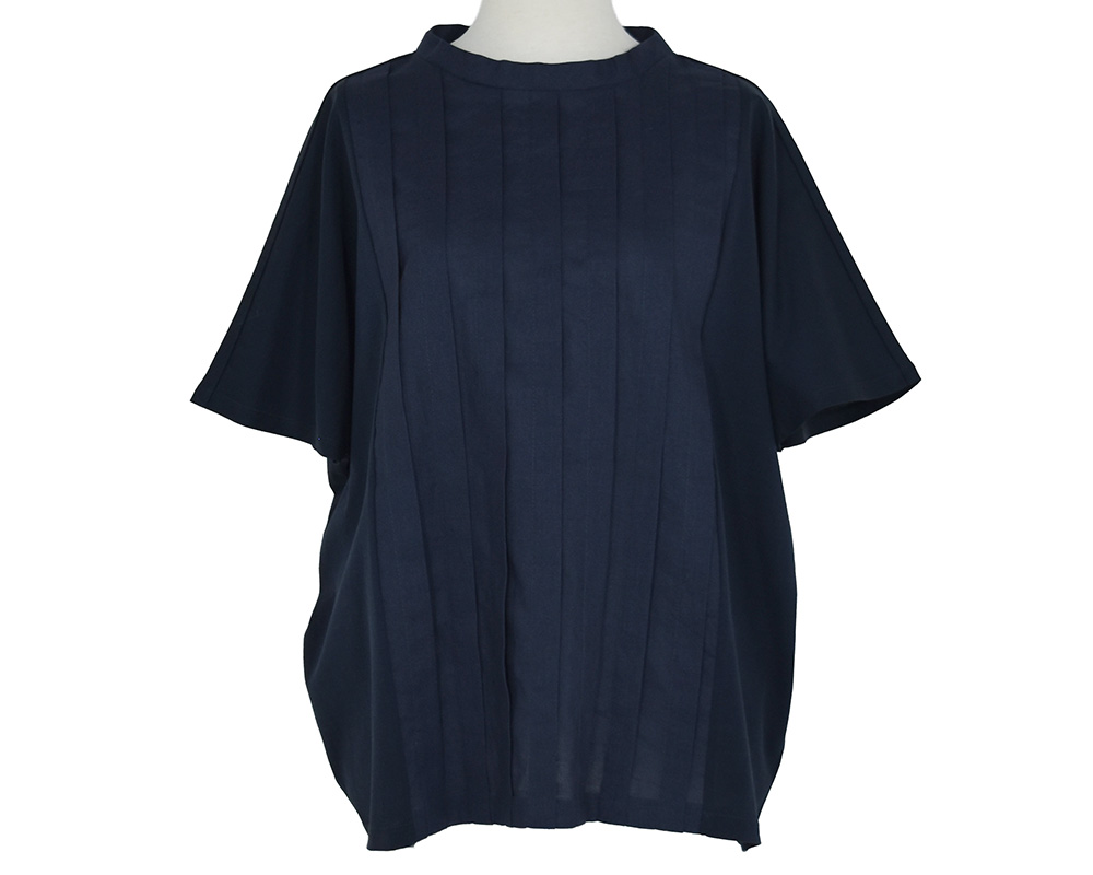 毎年ご好評いただいている布帛タック切り替えのカットソーです。前身頃に布帛を配したことでブラウスのようにきれい見えし、カジュアルすぎない上品な印象に仕上げています。後ろは釦あき仕様で、着脱もしやすいデザインです。