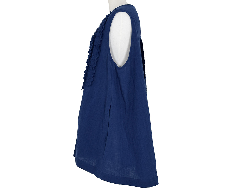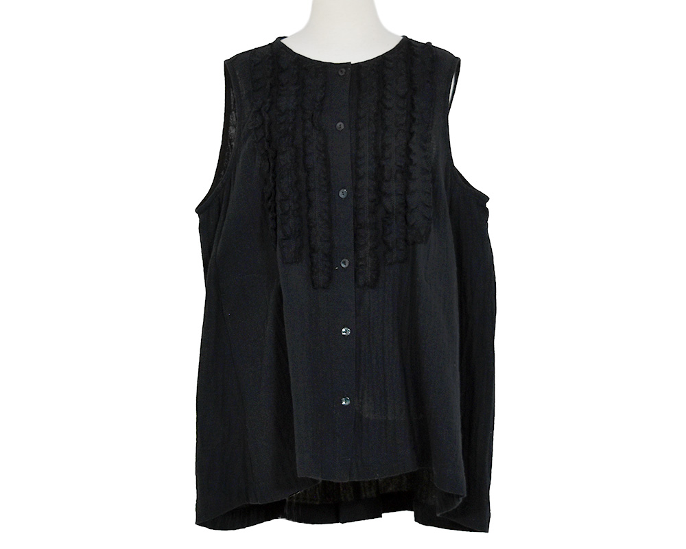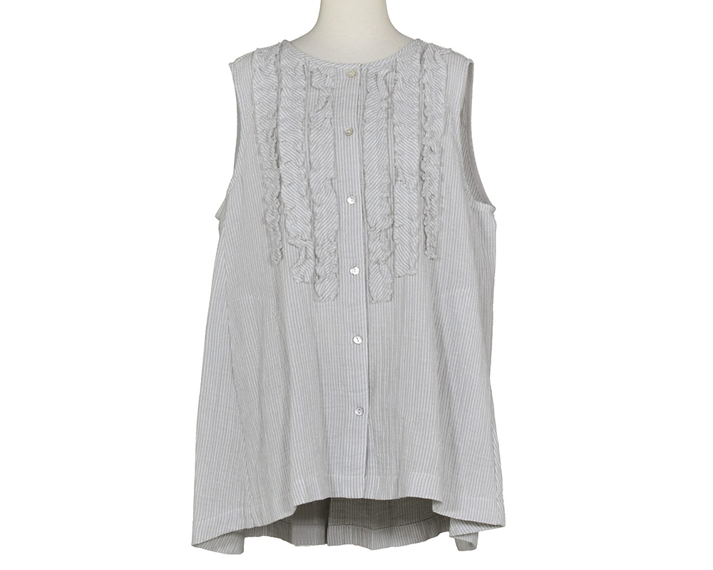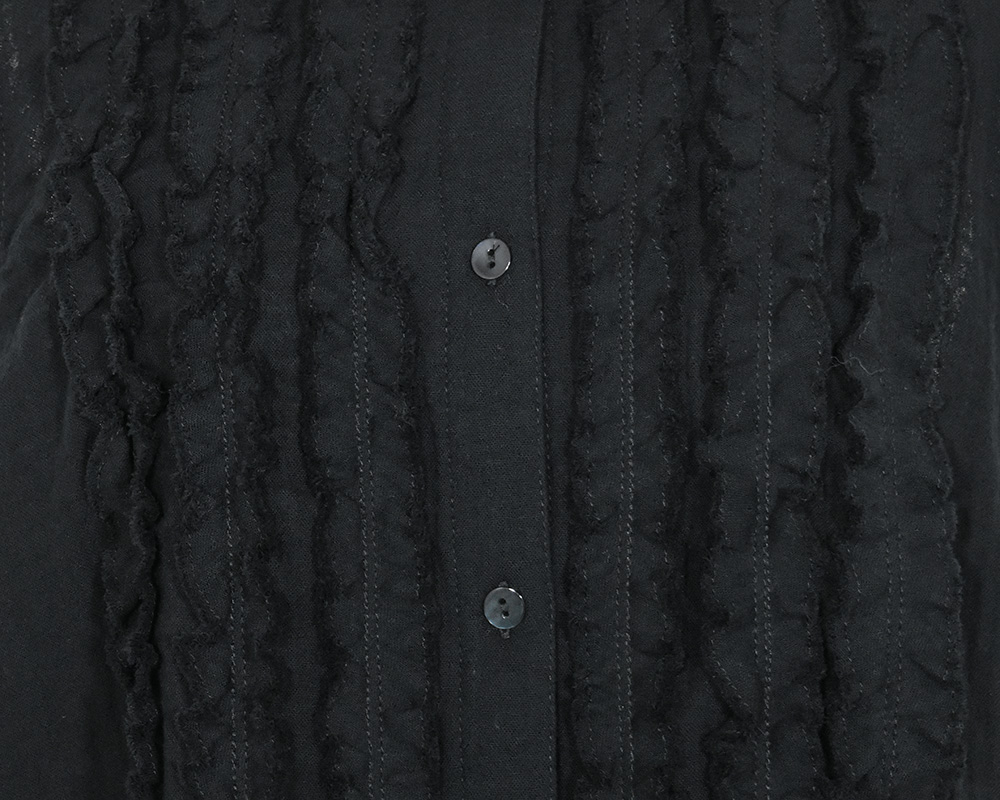 ふんわりと膨らみのある素材感を活かし、フロントフリルが華やかな印象のフレアシルエットのロングジレです。メッシュインナーやTシャツとの相性も良く、釦を外すことでコーディネートに合わせた着こなしを楽しめます。