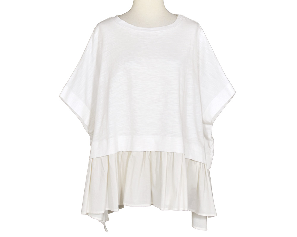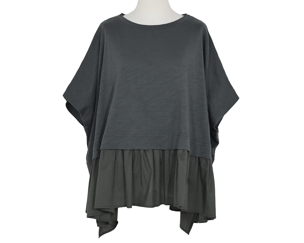 ボディラインをカバーしてくれるワイドなボックスシルエットのプルオーバーです。裾にたっぷりとギャザーを寄せた、動きのあるデザインがスタイリングのポイントになります。