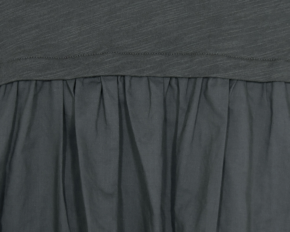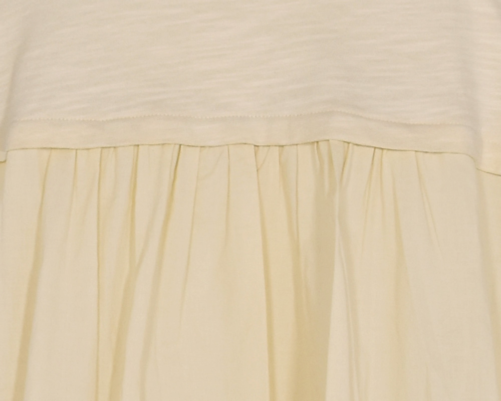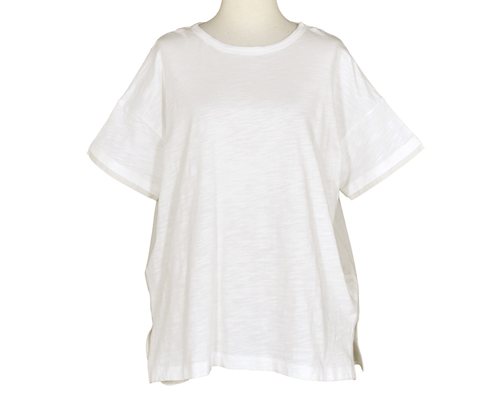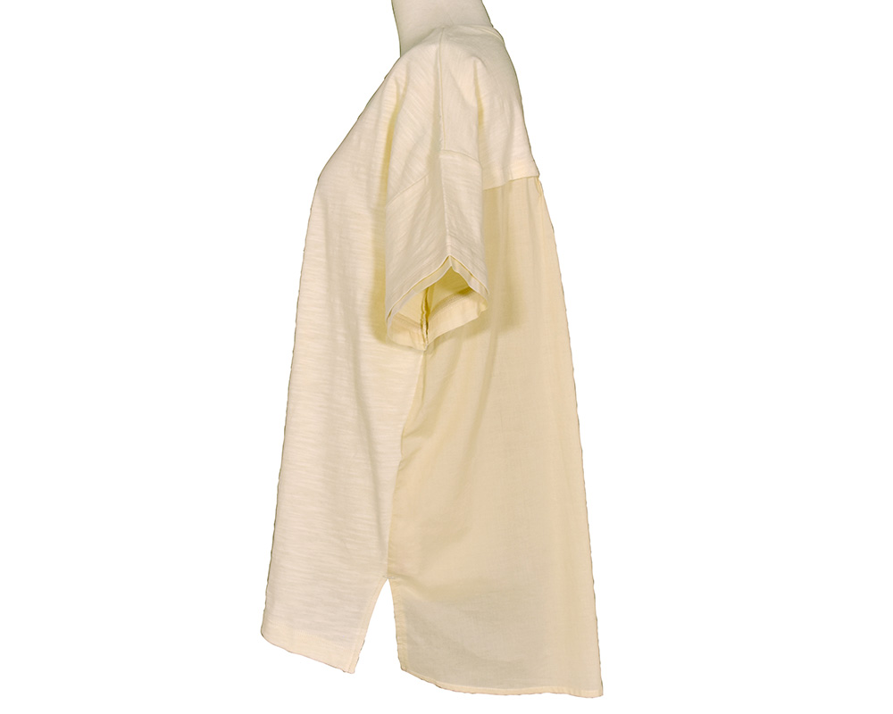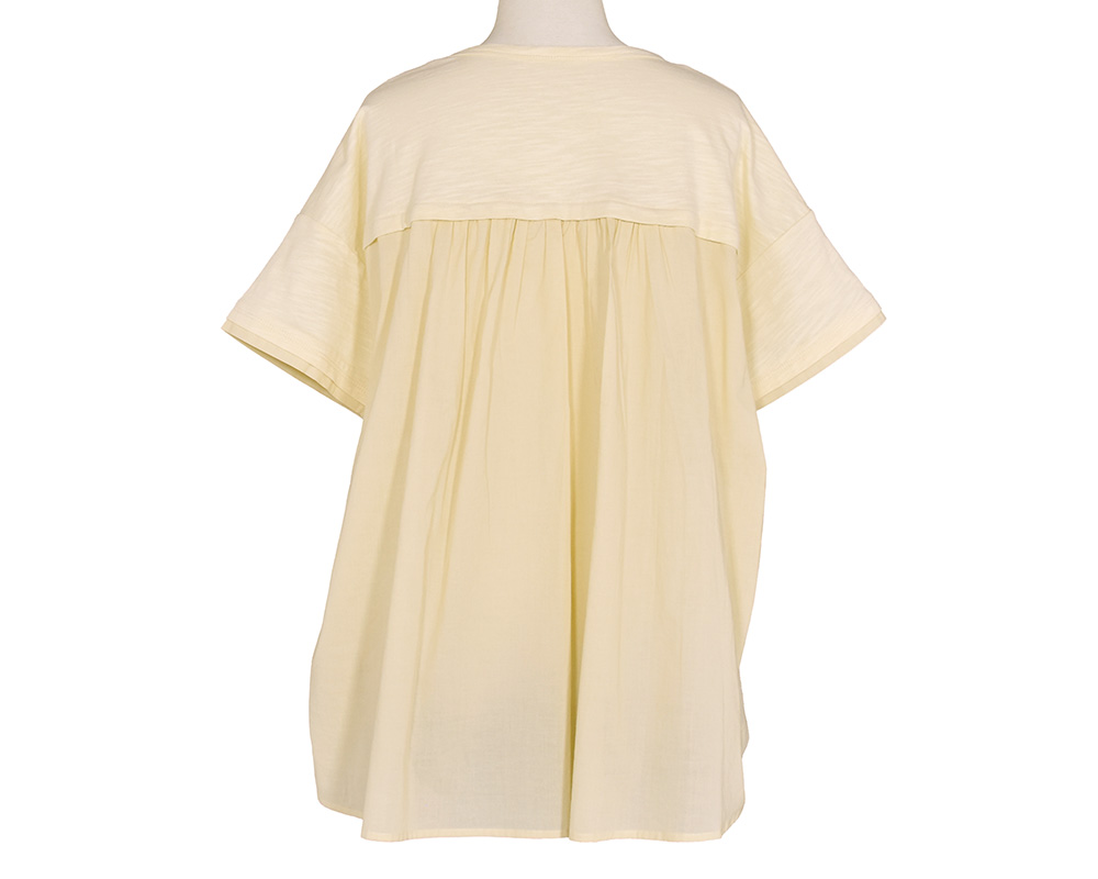 袖口と後ろ身頃に軽やかな布帛素材を使用したTシャツです。ギャザーを入れて切り替えたバックスタイルが涼やかで、着心地の良いデザインです。