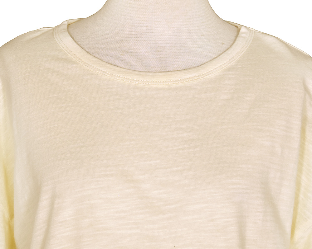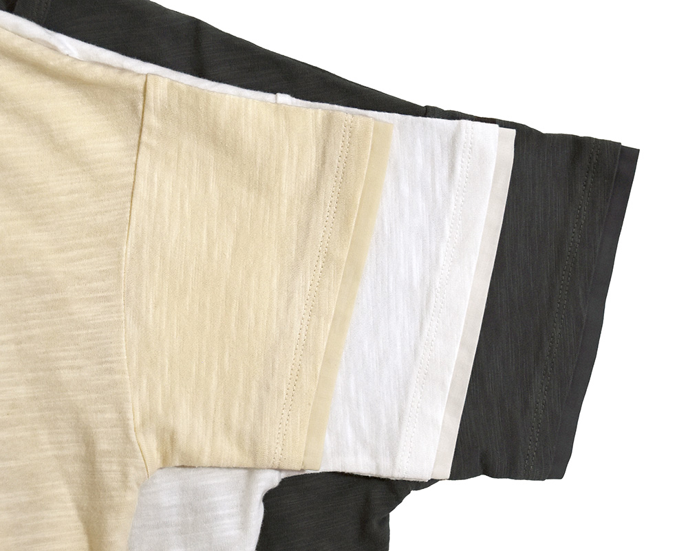 スラブ糸特有の濃淡や不規則な凹凸が、表情豊かな天竺素材です。軽やかで清涼感があり、ナチュラルな風合いが特徴です。