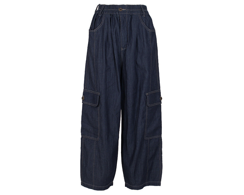 デニムと無地の2タイプで展開するカーゴバルーンパンツ。立体的なバルーンシルエットでありながら縦の切り替えが脚のラインをすっきり見せてくれます。裾にはダーツを入れ、丸みのあるフォルムをよりきれいに表現。サイドのカーゴポケットはあえて下目に配置し、アンティークゴールドの刻印釦を付けバランスの良いアクセントに。ウエストはゴム仕様で穿き心地がよく、幅広いコーディネートに活躍する一本です。