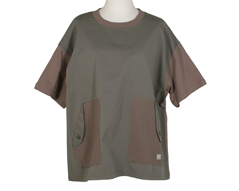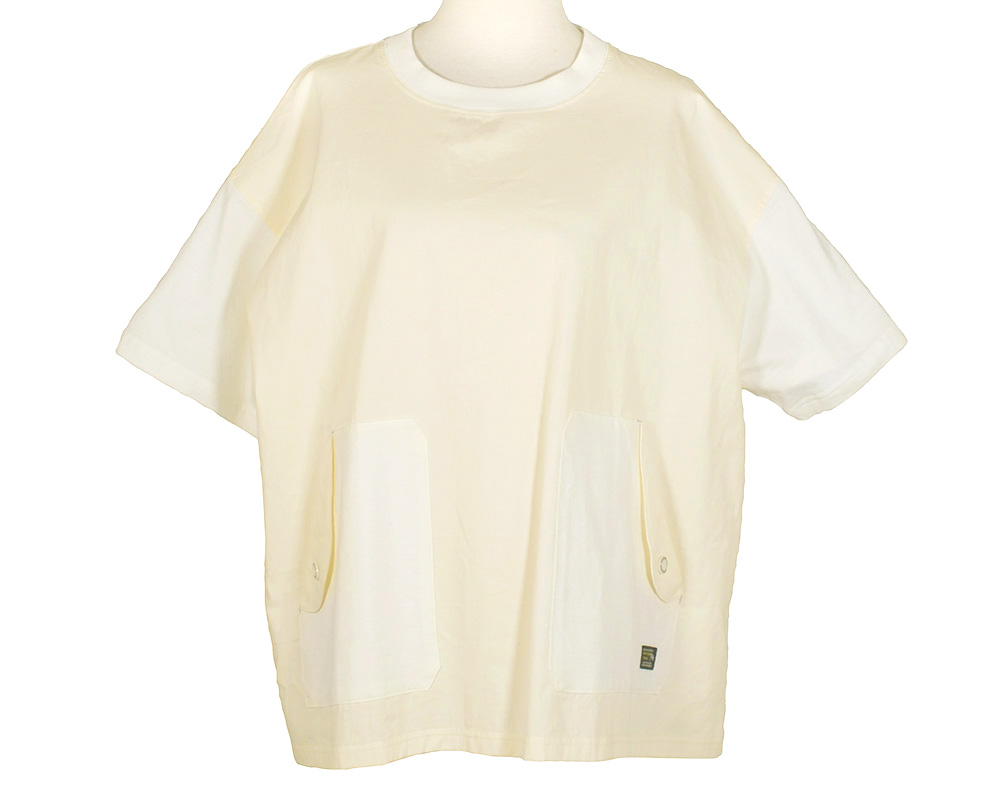 布帛生地を前身頃とポケットフラップに取り入れた、異素材づかいがポイントのカットソープルオーバー。カットソーならではの柔らかさに、布帛のほどよいハリが加わり、シンプルながら立体感のあるデザインに仕上がっています。ワイドシルエットがリラックス感を生みつつ、ラフになりすぎない程よいバランス。フラップ部分には刻印入りのボタンを付けさりげないアクセントに。デイリーに取り入れやすく、幅広いボトムと相性の良い万能アイテムです。