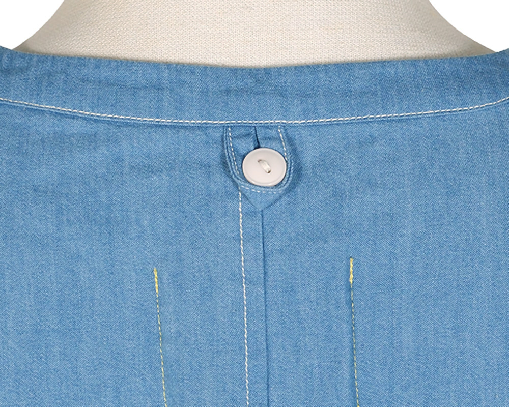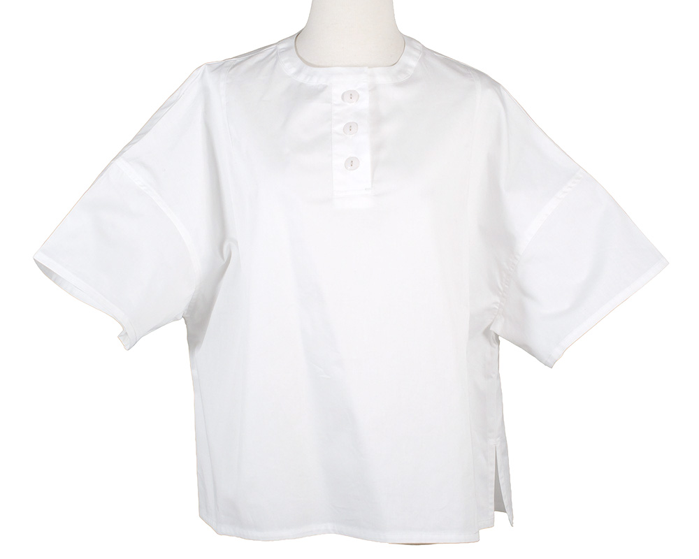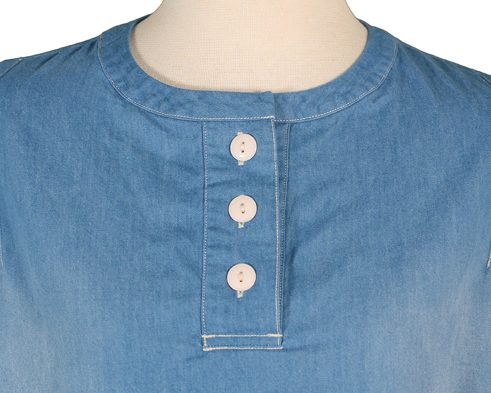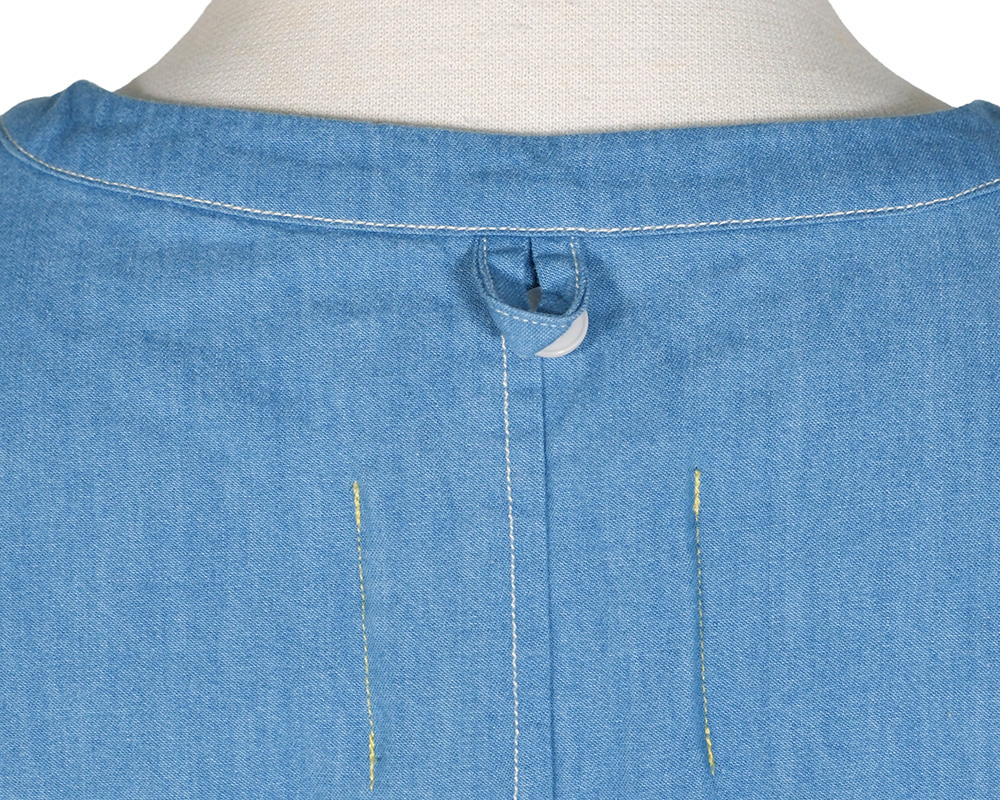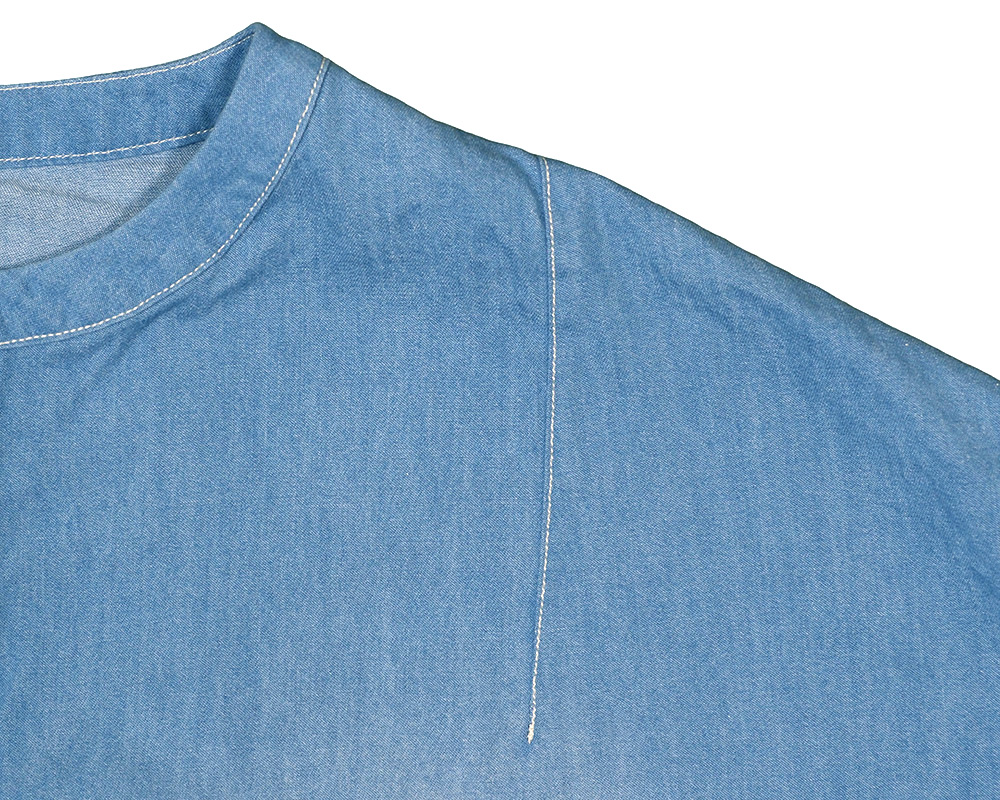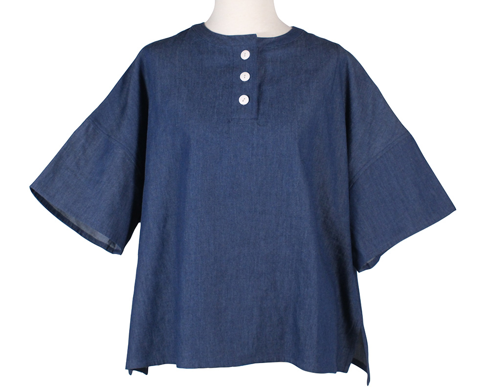 ライトオンスデニム、ライトオンスツイル素材を使用したヘンリーネックプルオーバー。ボックスシルエットで体のラインを拾いにくく、軽やかな着心地でデイリーに取り入れやすいアイテム。肩のダーツがシルエットに程よい立体感を生み、シンプルながらも表情のある仕上がりになっています。フロントのヘンリーネックデザインが、ラフさの中に程よい抜け感を演出。後襟下のループはボタンを外すと、フックなどに引っ掛けられる便利な仕様になっています。ワークウエアからヒントを得たディテールや仕様を取り入れた一枚です。