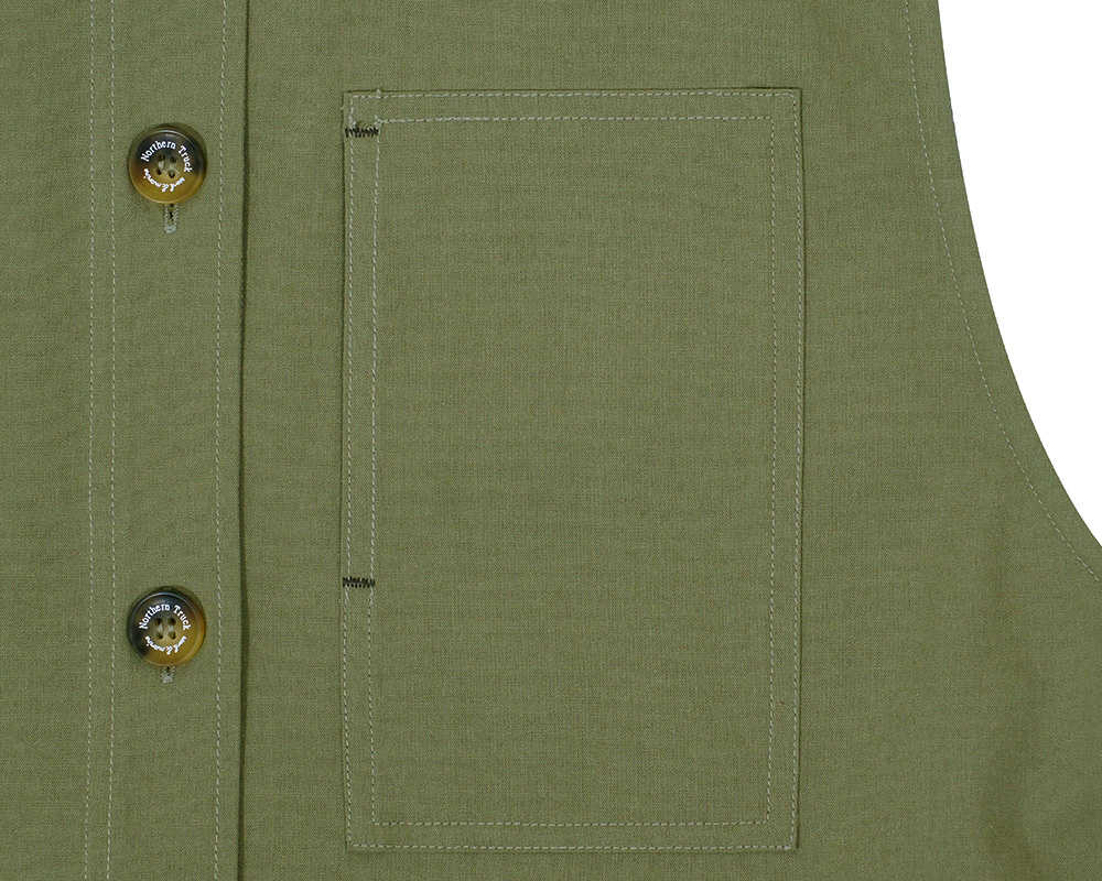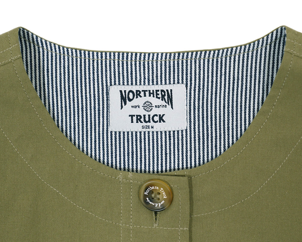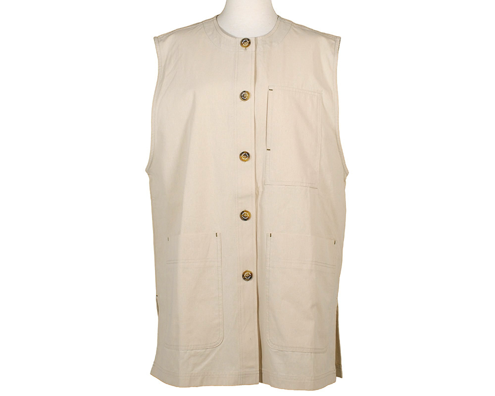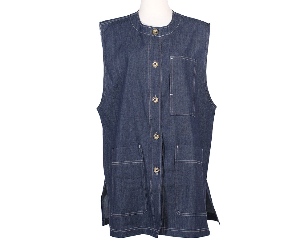 デニムと無地の2タイプで展開するノーカラーロングベスト。すっきりとした首元がレイヤードを引き立て、シャツやカットソー、ワンピースなど幅広いアイテムと好相性です。フロントのボタン開きと大きめのポケットが程よいアクセントとなり、実用性もあわせ持つデザインに。背あて布にはストライプ柄を採用し、見えない部分にもこだわりをプラス。ロング丈が縦のラインを強調し、軽やかな着心地で季節を問わず活躍します。コーディネートのアクセントになるアイテムです。