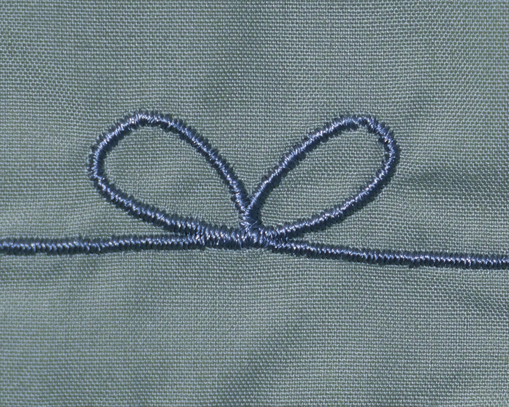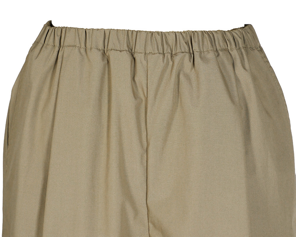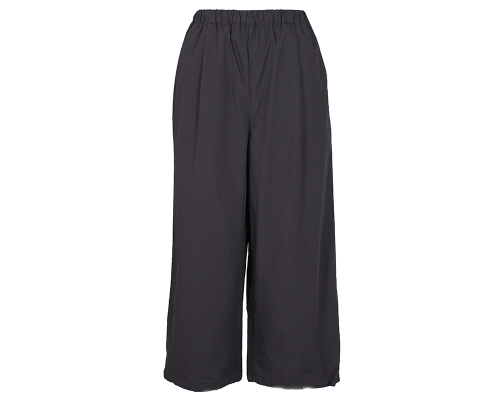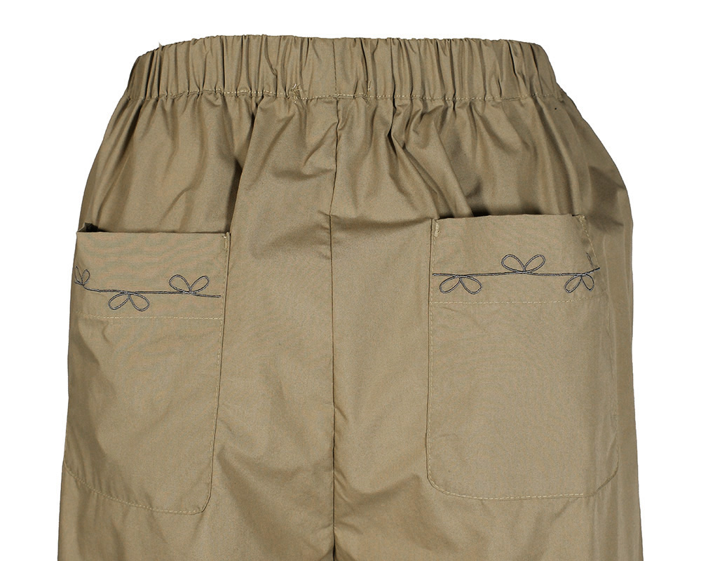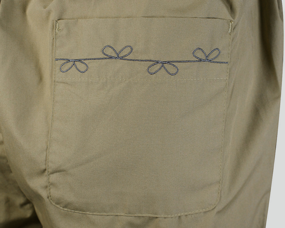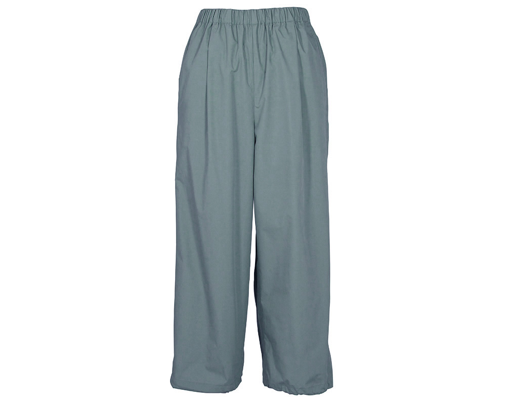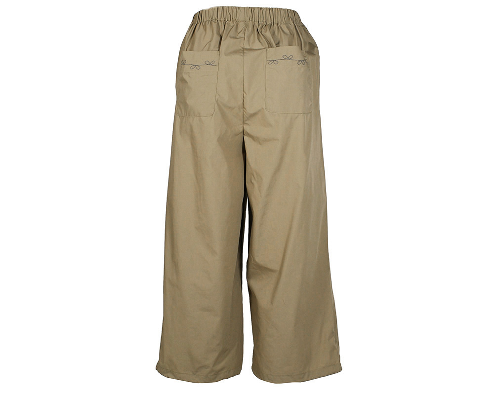 裾を絞ってシルエットを変えられるパンツで、気分に合わせてアレンジを楽しめます。軽くてやわらかなポリエステル綿の平織り素材です。後ろポケットに葉っぱの刺繍を添え、装いに小さな遊び心を加えたデザインです。
