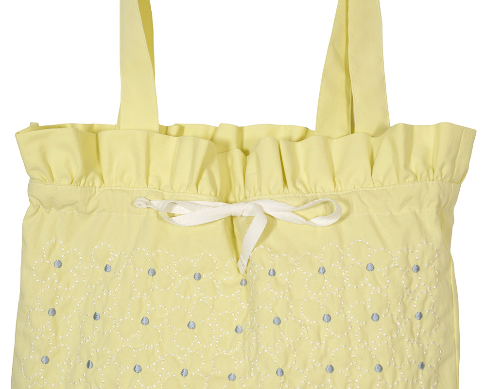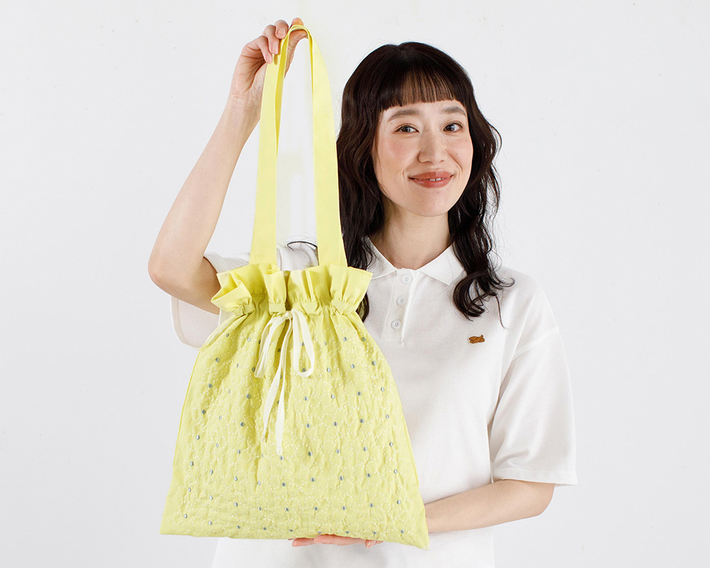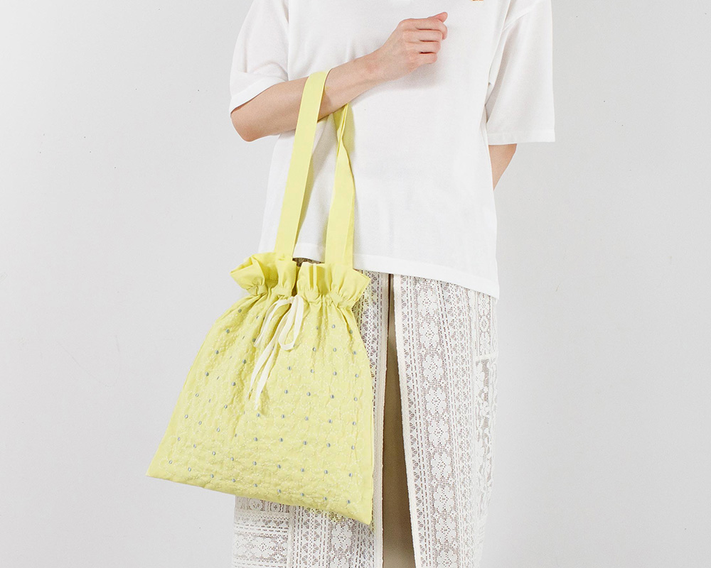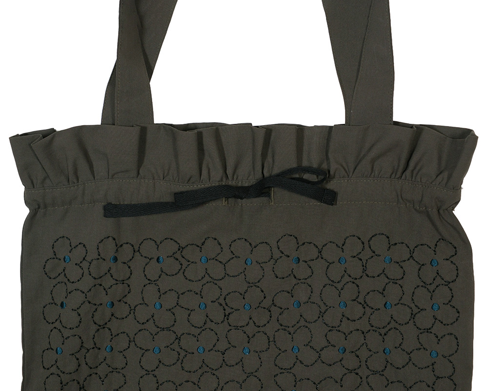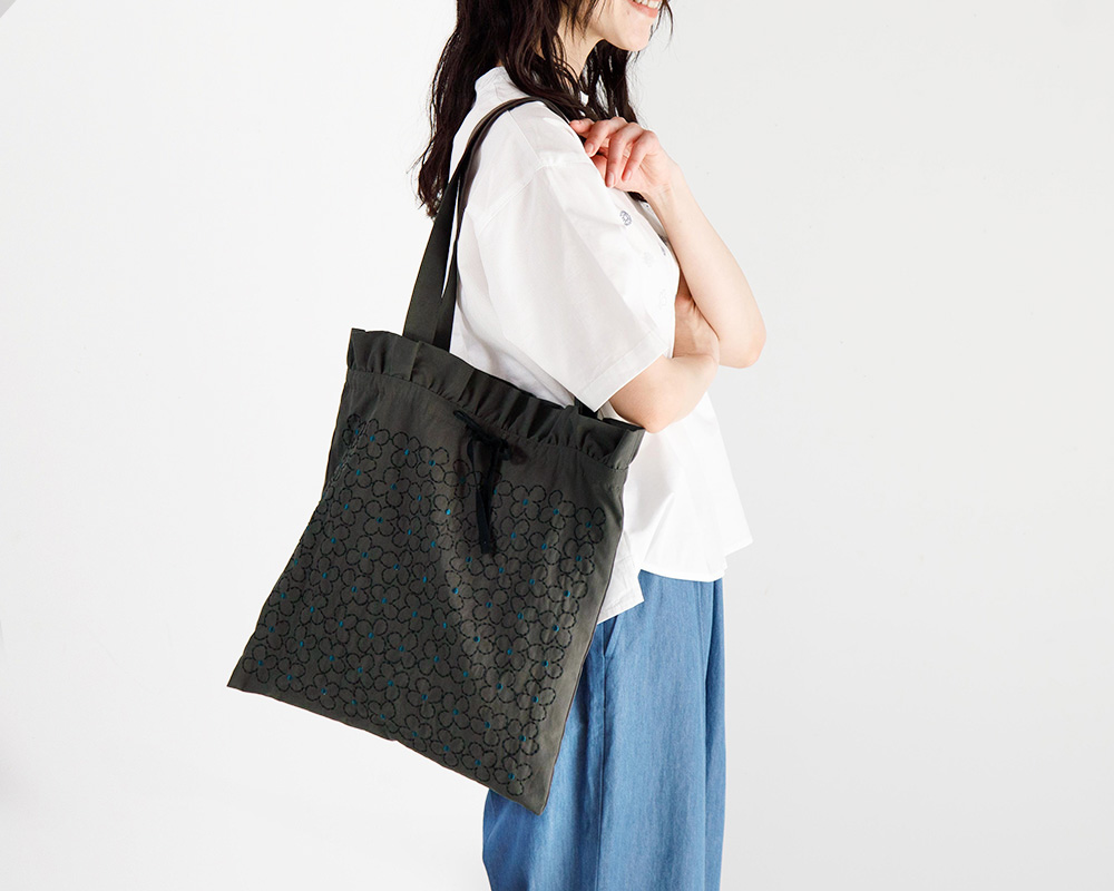 つながりモチーフのお花刺繍をあしらったバッグで、毎日のコーデになじみやすいデザインです。やわらかな綿素材で、デイリーに使いやすい持ち心地です。口紐を広げるとトートバッグのシルエットに。小物を入れる内ポケット付きです。
